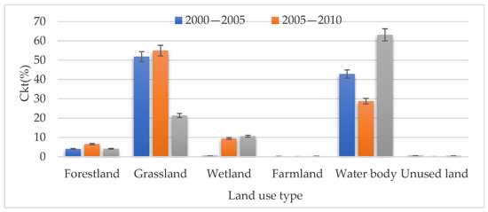 The most noticeable characteristics of land-use change in the nature reserves of western China in the whole study phase (2000–2010) were increases in water bodies and decreases in grassland. Especially in period I (2000–2005), the area of grassland declined by 1160.16 km2, while the area of water bodies increased by 1474.98 km2 (2.87%). In period II (2005–2010), other area changes were relatively stable except for construction land, which increased by 23.41%. The areas of forestland, water bodies, and construction land showed an increasing trend in both periods, while the areas of grassland, farmland, and unused land showed a continuously decreasing trend (Figure 5).