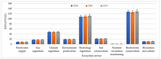 The ESVs of each ecosystem service are shown in Figure 7. The ESVs of biodiversity conservation had the biggest proportion of the total ESVs in all periods (2000–2005, 2005–2010, and 2000–2010), accounting for 34.86%, 34.64%, and 34.62%, respectively. In other words, biodiversity conservation was the most prominent function in the national nature reserves, as expected, followed by hydrology regulation (accounting for 29.49%, 29.92%, and 29.98%, respectively) and climate regulation (accounting for 13.25%, 13.13%, and 13.11%, respectively). The ESVs of nutrient circulation maintenance (0.46%) and recreation and culture (accounting for 3.10%, 3.09%, and 3.08%, respectively) had the smallest percentages. During 2000–2005, the ESVs of freshwater supply and hydrology regulation increased, by 1.15% and 1.27%, respectively, while the other ESVs all decreased by 0.89% on average. During 2005–2010 and 2000–2010, the ESVs of every ecosystem increased, by 2.18% and 1.74% on average, respectively. Although the ESV for grassland registered a substantial reduction during 2000–2005, that of water bodies registered a substantial increase over 2005–2010, resulting in an overall ESV increase. The Wilcoxon signed-rank test in SPSS 21.0 indicated that the ESVs of each ecosystem service increased significantly from 2000 to 2010 (p = 0.008 < 0.05), showing that the total ESV registered a significant increase in the national nature reserves in western China during 2000–2010.
