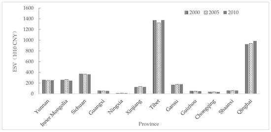 Among the 12 provinces in the western region of China, the national nature reserves in Tibet and Qinghai Province had significantly higher total ESVs, accounting for approximately 36.79% and 25.73% of the total ESV of the national nature reserves in the western region, respectively (Figure 8). In contrast, the total ESVs in the national nature reserves in Ningxia and Guizhou Province were relatively low, accounting for only 0.31% and 1.31% of the total ESV. The ESV quantities were directly related to the non-construction land area. The highest proportion of non-construction land was in the national nature reserves in Tibet and Qinghai Province, accounting for 42.83% and 23.99% of the non-construction land in the national nature reserves in the western region, while the non-construction land area in the national nature reserves in Ningxia and Guizhou Province only account for 0.51% and 0.30%, respectively. From 2000 to 2010, the ESV in the national nature reserves in Guangxi increased the most significantly, with a growth rate of 40.36%, followed by Shaanxi and Gansu, with a growth rate of 7.74% and 7.41%, respectively (Figure 9, Figure 10 and Figure 11).