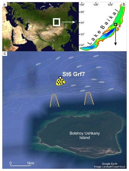 - Takhteev, V.V.; Bukharov, A.A.; Proviz, V.I.; Sitnikova, T.Y.; Galkin, A.N. A peculiarity of bottom fauna within unusual geological environment of the northern slope of Bolshoi Ushkany Island (Lake Baikal). In Studies of the Fauna in Waters Bodies of Eastern Siberia; Takhtaeev, V.V., Ed.; Irkutsk University: Irkutsk, Russia, 2001; pp. 3–8. [Google Scholar]