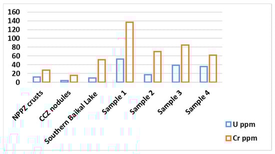 U and Cr concentrations in Fe-Mn nodules from the slope of Bolshoy Ushkany Island and the Southern basin of Lake Baikal (our data), cobalt-rich crusts from North Pacific Prime Zone (NPPZ) and nodules of the Clarion–Clipperton Zone in the Pacific Ocean (CCZ) [,].