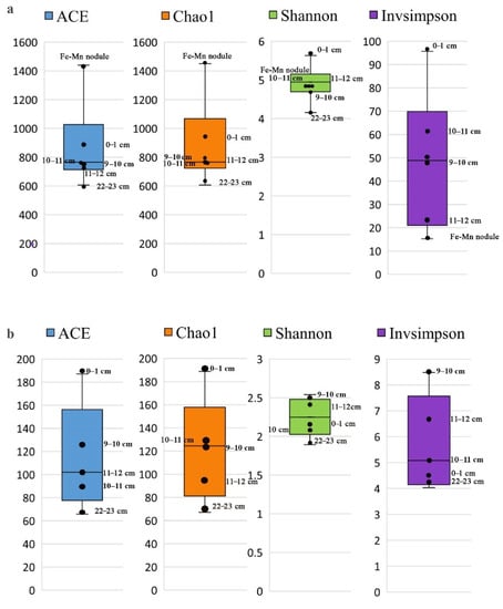 Box plots show (a) bacterial and (b) archaeal alpha diversity (ACE and Chao1 hidden richness estimators, Shannon Index and inverse Simpson Index); variation across samples from Bolshoy Ushkany Island based on non-rarefied data (for a cluster distance of 0.03).