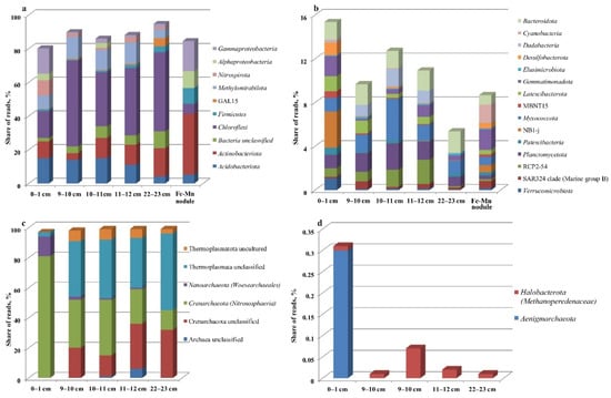 Taxonomic composition (a,b) of the bacterial and (c,d) archaeal communities in the bottom sediments near Bolshoy Ushkany Island, as well as in the Fe-Mn nodule at the phylum level; a,c—more than 97% of reads; (b,d)—less than 3% of reads.