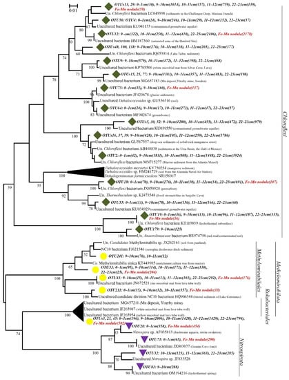 Contribution to the bacteria of the phylum Methylomirabilota involved in the methane cycle is a varied. The number of sequences of this phylum in the communities of Fe-Mn nodules was less (2.4%) than in the communities of Fe-Mn layers (12–13%) and in sedimentary layers 0–1 cm and 22–23 cm (8.7% and 5.2%, respectively). Some order Methylomirabilales sequences of different OTUs formed one cluster in the phylogenetic tree and some OTU (Figure 7) groups with the sequences that we had previously detected in the sediments of methane seeped from the southern and central basins of Lake Baikal as well as in other ecosystems, including sediments of the freshwater Lake Constance. Members of Rokubacteriales (Methylomirabilota) order with mixotrophic metabolism that associated with nitrate respiration are more popular in the communities of Ushkanyi sediments []. The sequences from volcanic and manganese deposits and from soil and freshwater ecosystems were identified among the closest homologues.