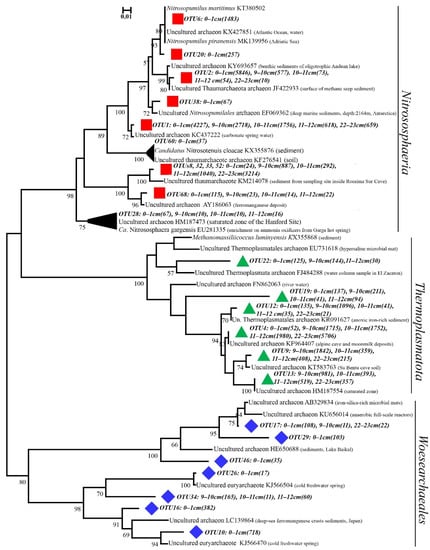 NJ phylogenetic tree of dominant phyla based on 16S rRNA gene sequences of class Nitrososphaeria (Crenarchaeota), order Woesearchaeales and phylum Thermaplasmatota. Bootstrap values > 50% (of 100 replicates) are shown in front of respective nodes, and the scale bar represents 5% sequence divergence. OTUs described in this work are represented by squares, lozenges, and triangles.
