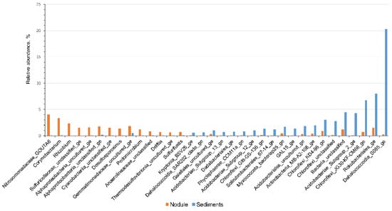 OTUs0.03 with relative abundance > 0.5% (on average for sediments and in absolute values for the nodule) and difference in relative abundance between the nodule and sediments by a factor of three or more.