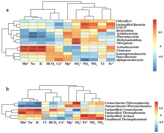 Heat map of correlation relationships (Spearman correlation) between (a) bacterial/(b) archaeal taxa and the concentration of individual ions in the pore water of the investigated bottom sediments. Different colors indicate correlation coefficients based on the color scale to the right of the heat map. The coefficients pv < 0.05 are shown.