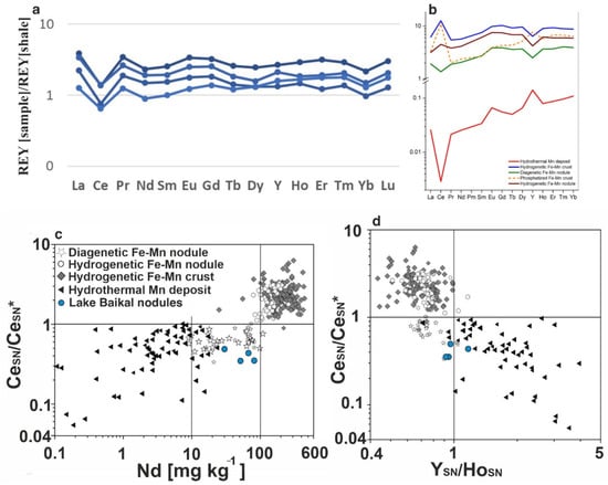 (a) Distribution of REY normalized to PAAS of Fe-Mn nodules from Ushkani islands; (b) Examples of typical REY patterns of marine hydrothermal Fe and Mn deposits, diagenetic Fe–Mn nodules, hydrogenetic Fe–Mn nodules, hydrogenetic Fe–Mn crusts, and phosphatized hydrogenetic Fe–Mn crusts; Marine Fe–Mn oxyhydroxide deposits for (c) CeSN/CeSN* vs. Nd concentration and (d) CeSN/CeSN* ratio vs. YSN/HoSN (Bau et al., 2014); SN is shale normalized to Post-Archean Australian Shale, PAAS (McLennan, 1989); Ce* = Ce anomaly (CeSN* = 0.5LaSN + 0.5 PrSN).