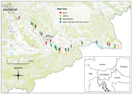 Distribution of the studied waterbodies in the floodplain of the Drava river (Base map source: Surveying and Mapping Authority of the republic of Slovenia (2016).