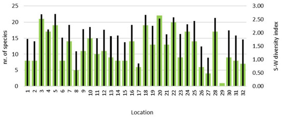 Total species number (green bars) and Shannon–Wiener (S–W) diversity index (black lines) in surveyed waterbodies.