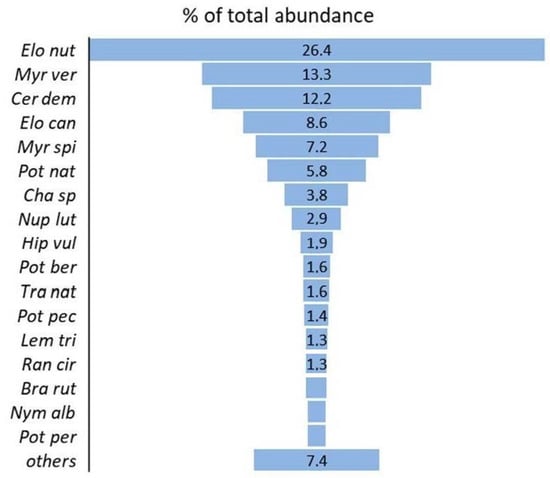 Ratio of total relative abundance of hydrophyte species that presented more than 1% in surveyed waterbodies: Elo nut—Elodea nuttallii, Myr ver—Myriophyllum verticillatum, Cer dem—Ceratophyllum demersum, Elo can—Elodea canadensis, Myr spi—Myriophyllum spicatum, Pot nat—Potamogeton natans, Cha sp—Chara species, Nup lut—Nuphar luteum, Hip vul—Hippuris vulgaris, Pot ber—Potamogeton bertholdii, Tra nat—Trapa natans, Pot pec—Potamogeton pectinatus, Lem tri—Lemna trisulca, Ran cir—Ranunculus circinatus, Bra rut—Brachythecium rutabulum, Nym alb—Nymphaea alba, Pot per—Potamogeton perfoliatus, others—the sum of abundances of species with less than 1%.