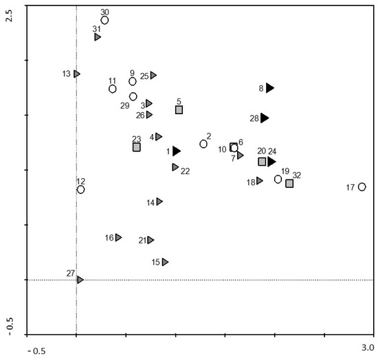 Detrended correspondence analysis ordination diagram showing the similarity of the macrophyte stands in different sites. Numbers from 1 to 32 indicate the location of the site with respect to the river Drava flow direction. Different symbols indicate different water bodies (white circles—ponds, light grey squares—oxbows, small dark grey right triangles—side channels, black right triangle—sample sites in the main channel of the river Drava.