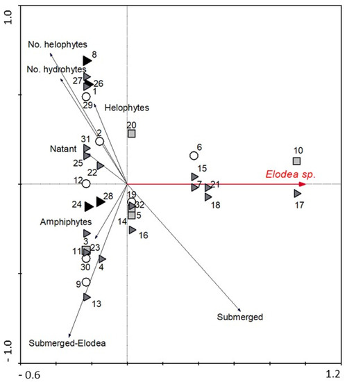 Redundancy analysis plot showing the relationship between the number of different ecological groups of macrophytes and relative abundance of their growth forms and Elodea species abundance. Abundance of submerged plants is represented by two parameters, including and excluding Elodea (-Elodea). Different symbols indicate different water bodies (white circles—ponds, light grey squares—oxbows, small dark grey right triangles—side channels, black right triangle—sites in the main channel of the river Drava.