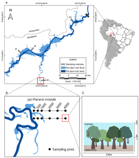 Four sampling modules were installed 10–100 km upstream of the dam. The configuration of the modules followed the RAPELD biodiversity survey method developed by the Biodiversity Research Program (PPBio) [38]. Three modules were located on the left bank of the Madeira River, in Teotônio (TE), Ilha de Búfalos (IB) and Ilha das Pedras (IP), and one on the right bank of the Jaci-Paraná River (JP), an affluent of the Madeira River (Figure 1a). Each module consisted of two 4-km parallel transects perpendicular to the Madeira River, separated by 1 km. We installed six plots along the two transects, 0, 500, 1000, 2000, 3000, and 4000 m from the original river bank (Figure 1b).