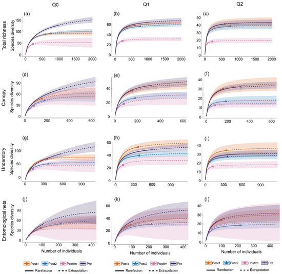 Individuals number-based rarefaction and extrapolation curves for butterfly communities before (Pre), immediately after (PostIm), one year after (Post1), and two years after (Post2) the filling of the Santo Antônio dam on the Madeira River in southwestern Amazonia, Brazil based on the thee sampling techniques (a–c), canopy traps (d–f), understory traps and (g–i) and entomological nets (j–l). 95% unconditional confidence intervals are shown by shading, based on bootstrapping with 1000 replications. Each curve is extrapolated to twice the maximum size of the largest sample.