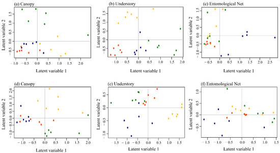 EcoCopula ordination based on occurrence (a–c) and abundance data (d–f) of butterfly species before (Pre = green), immediately after (PostIm = red), one year after (Post1 = yellow) and two years after (Post2 = blue) the creation of the Santo Antônio dam on the Madeira River in southwestern Amazonia, Brazil. Latent variables (unobserved environmental gradients) are shown for three different sampling techniques: canopy, understory, and entomological nets. The dots represent distances from the river 0, 500, 1000, 2000, 3000, and 4000 m.