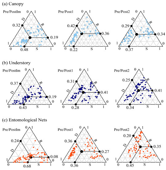 SDR-simplex plots generated from pairwise comparisons before (Pre, PostIm, Post1, and Post2) after the creation of the Santo Antônio dam on the Madeira River in southwestern Amazonia, Brazil. The graphs axes represent: S (similarity), D (Abundance Difference), and R (replacement). The three different sampling techniques were (a) canopy, (b) understory, and (c) entomological nets. The values are based on the Ruzicka dissimilarity matrix for abundance data. Each point represents a pair of sites and the large central dot in each triangle represents the centroid of the points.