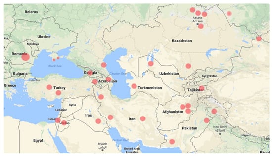 The general distribution of the species from West to East includes South-East Romania, Crimea, Turkey, Israel, Jordan, Georgia, Armenia, Azerbaijan, Dagestan, Iran, Turkmenistan, Uzbekistan, Tajikistan, Kazakhstan, Russia (on the shore of Lake Kulundinskoe, Altai Krai), China (on the border with Mongolia and Russia), Afghanistan, Pakistan, and India (Figure 1).