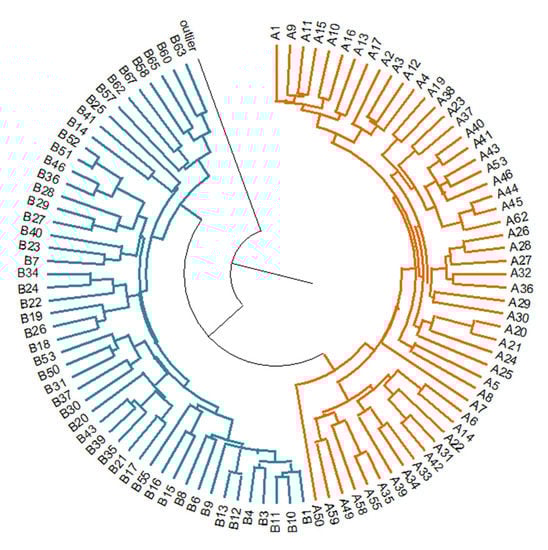 Dendrogram showing genetic relationships of 103 Nitraria accessions based on ISSR data (in orange—Pâclele Mari individuals, in blue—Pâclele Mici individuals, black line—outlier N. komarovii).
