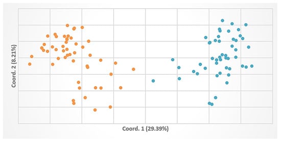 Principal Coordinates Analysis using the selected ISSR markers from 102 individuals (in orange—Pâclele Mari individuals, in blue—Pâclele Mici individuals).