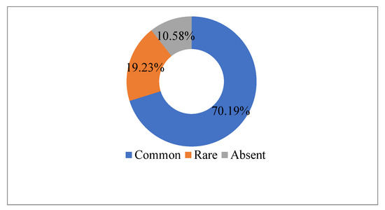 Eighty sightings of grey wolf were reported by the respondents in the last two years, (2020–2021), with an average annual sighting of 0.38 per respondent. A large number of the respondents declared the grey wolf as common species, followed by rare and absent (Figure 2).