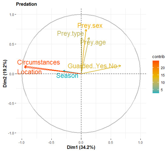 The distribution of the seven factors considered in predation-based PCA is presented in Table 2. The PCA loadings extracted for predation are presented as a biplot in Figure 3 for the first two PCA components. The first component, Dim 1, explains 34.2% of the total variation, while the second component, Dim 2, explains 19.2% of the total variation. The importance of each factor over the PCA is presented by orange color intensity, suggesting that ‘location’ and ‘circumstances’ were the most significant factors in livestock predation. Prey sex, prey type, prey age, and guarded have a small role in livestock predation, and aminor contribution was reported for season (Table 2, Figure 3).