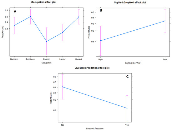 The best GLM model with an AIC of 90.884 (Table 4, Figure 5) revealed that the respondent’s attitude was significantly influenced by occupation, grey wolf sightings, and livestock predation. With business reference, farmers have a negative attitude (p = 0.040). Similarly, the employees (p = 0.025) and students (p = 0.030) have a significant positive attitude toward the grey wolf. The model further revealed that respondents with less sightings of the grey wolf have a considerably more encouraging attitude (p = 0.01) towards grey wolves (Figure 5B). However, the attitude was quite negative (p = 0.006) in the case of respondents who suffered from high livestock predations (Figure 5C).