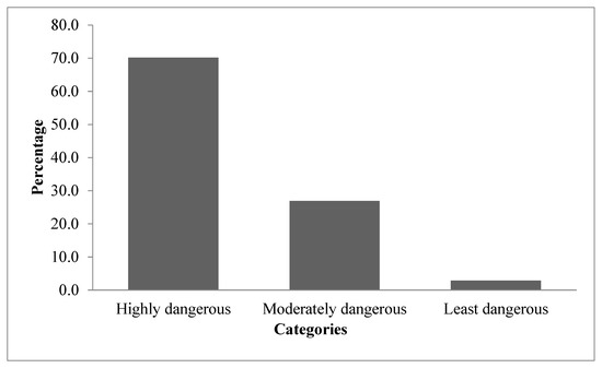 The majority of the respondents (70.2%) considered the grey wolf as extremely dangerous for livestock, while 2.9% of the respondents declared it as the least dangerous (Figure 6).