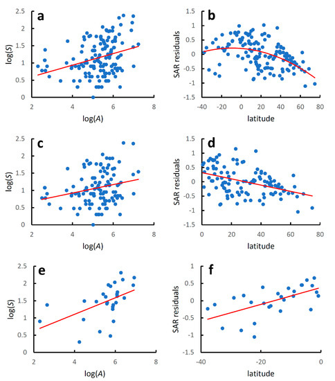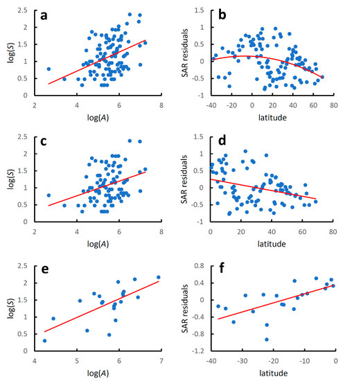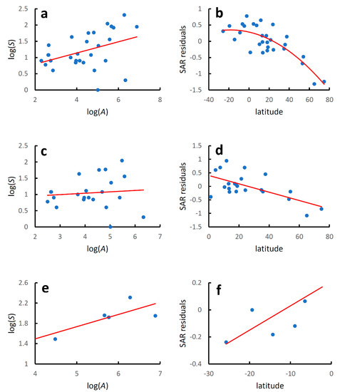 Because the areas (countries) considered in this study had different sizes, residuals from species–area relationships fitted with the power function were used as area-corrected values of richness to investigate latitudinal patterns. The use of different functions to fit the species–area relationship would obviously produce different sets of residuals. Thus, results will change according to the function(s) used to fit the species–area relationship. In this paper, the linearized version of the power function was used to fit the species–area relationship in all cases as this model typically provides the best fit and it is easy to interpret [94,95,96]. However, it would be useful in the future to explore the effect of using other competitive models.