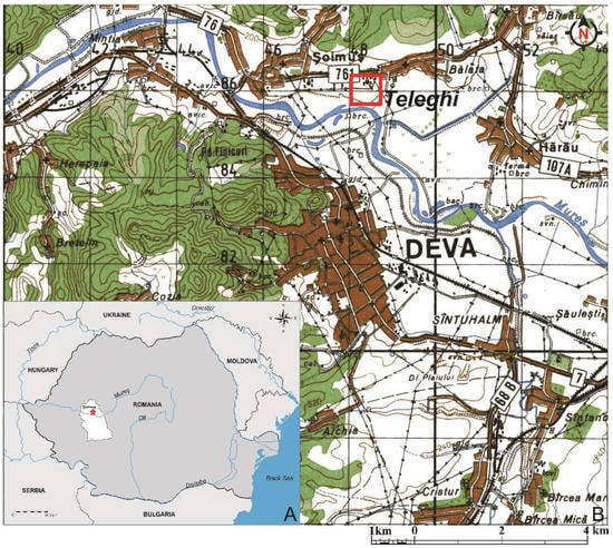 Location of Şoimuş village (red star) within the territory of Romania (A); Teleghi site (red square) on the topographic map (1996) and surrounds (B).