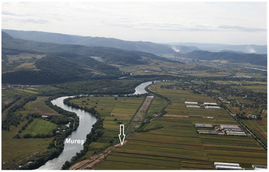 The archaeological site from Teleghi (Lat. 45°54′36.1″ N, Long. 22°54′33.0″ E, Alt. 187.8 m) is located about 2 km north of the municipality of Deva and 1.5 km southeast of Șoimuș (Figure 1), on a natural terrace bridge dating from Pleistocene (Figure 2), on the right side of Mureș River, with an altitude of 5–10 m above the meadow [28]. In relation to the main water course, the site from Teleghi is located at the entrance to the depression area, with a gorge aspect, of the Mureș River valley [29,30,31].