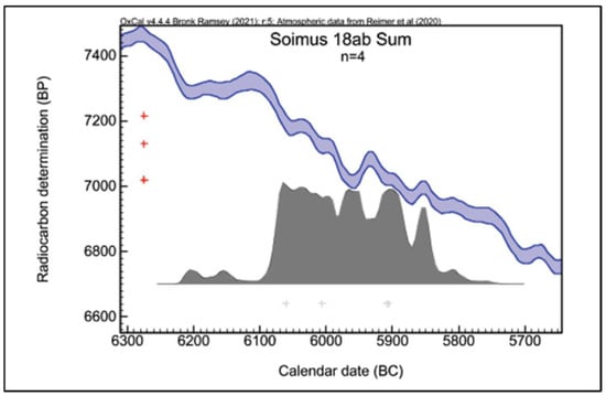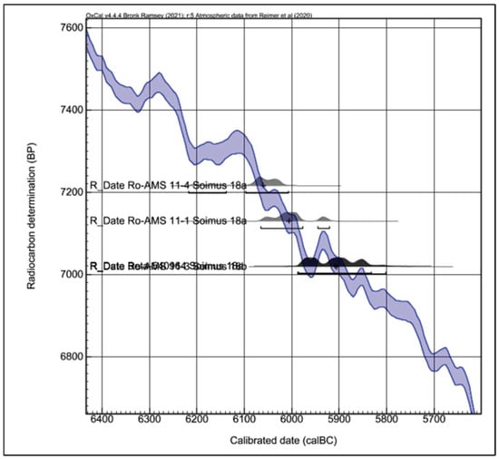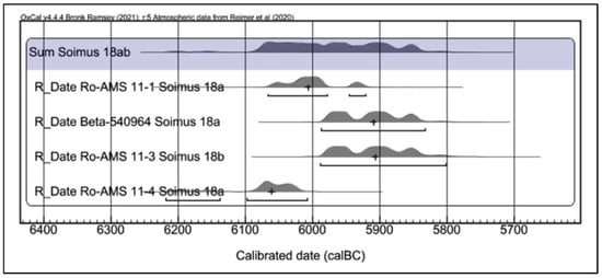 The results of applying the radiocarbon method to six samples of osteological material, all collected from C. 18a and C. 18b of the Teleghi site, eliminating the very early ages 6266 (82.9%) 6079 cal BC (Ro-AMS 11–2) or the latest 5836 (90.2%) 5708 cal BC (Beta-540963), could outline the following chronological scheme for C.18 (Figure 5 and Figure 6): I. Feature C. 18a corresponds to the end of the 7th millennium cal BC, respectively, and the beginning of the 6th millennium cal BC, reflected by the two close time intervals—6098 (80.7%) 6008 cal BC (Ro-AMS 11–4) and 6066 (82.2%) 5978 cal BC (Ro-AMS 11–1); II. The C. 18b feature would be placed at the beginning of the 6th millennium cal BC, as indicated by the interval 5989 (93.4%) 5802 cal BC (Ro-AMS 11–3) and the result of a sample from C.18a—5987 (95.4%) 5833 cal BC BC (Beta-540964), which would be more typical of human activity in C.18b. The sum of four usable dates from features C.18a and C.18b show that the dwelling from the feature C.18 is dated approximately between 6080 BC and 5850 BC (Figure 5 and Figure 7).