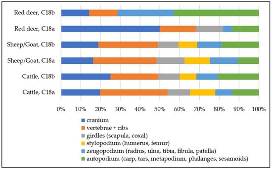 Based on 26 remains collected from the C18a, a minimum of six individuals could be estimated: three of red deer (two mature and one immature) and one mature individual for each of aurochs, wild boar, and roe deer (Table 4). The distribution of remains in skeletal regions is relatively similar as in the case of C.18b (Figure 8).