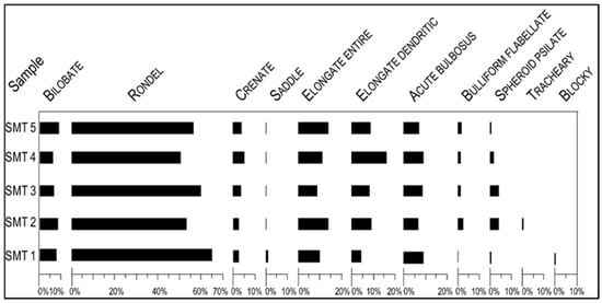 The SPHEROID PSILATE morphotype is characteristic of dicot plants [67,72,73,74] and was identified in all samples, composing up to 4.17% of the total. In general, it is considered that this type of phytolith can be used as a forest indicator [75].