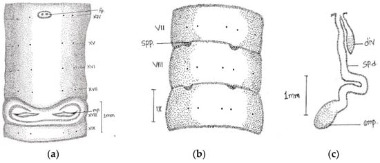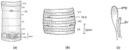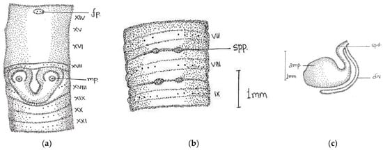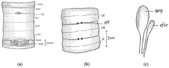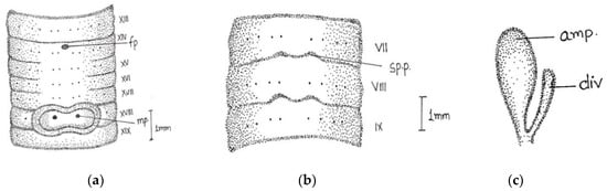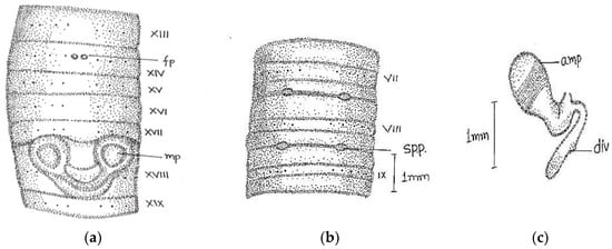 Abbreviations used: sp., spermathecal pores; fp., female pore; mp., male pore; amp, ampulla; div., diverticulum; sp.d., spermathecal duct.