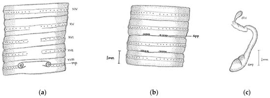 Camera lucida illustration of Megascolex polytheca polytheca (a) genital region; (b) spermathecal pore; (c) spermathecae.