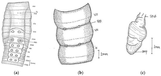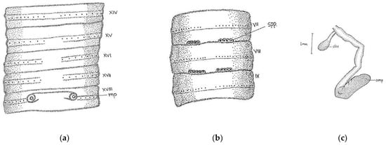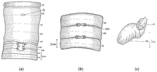 Camera lucida illustration of Megascolex filiciseta (a) genital region; (b) spermathecal pore; (c) spermathecae.