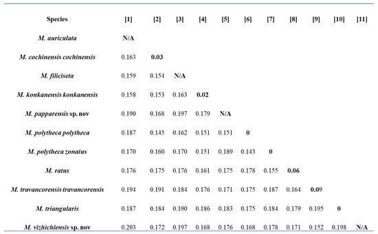 Intraspecific (bold diagonally) and interspecific uncorrected pairwise genetic distances of Megascolex species. Species with single COI sequence are represented by N/A.