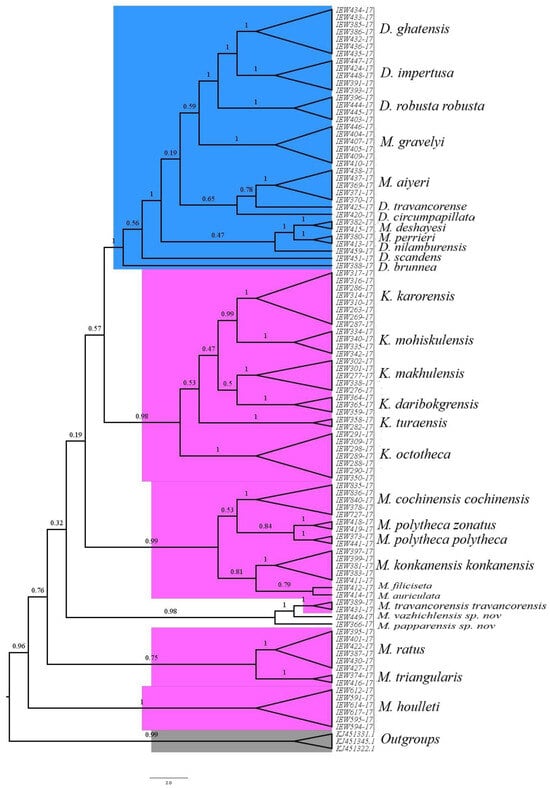 BI phylogenetic tree, depicting paraphyletic clades of Megascolex species with posterior probabilities node values at each node. The families Moniligastridae and Megascolecidae are represented in blue and pink colours; grey colour shows outgroups.