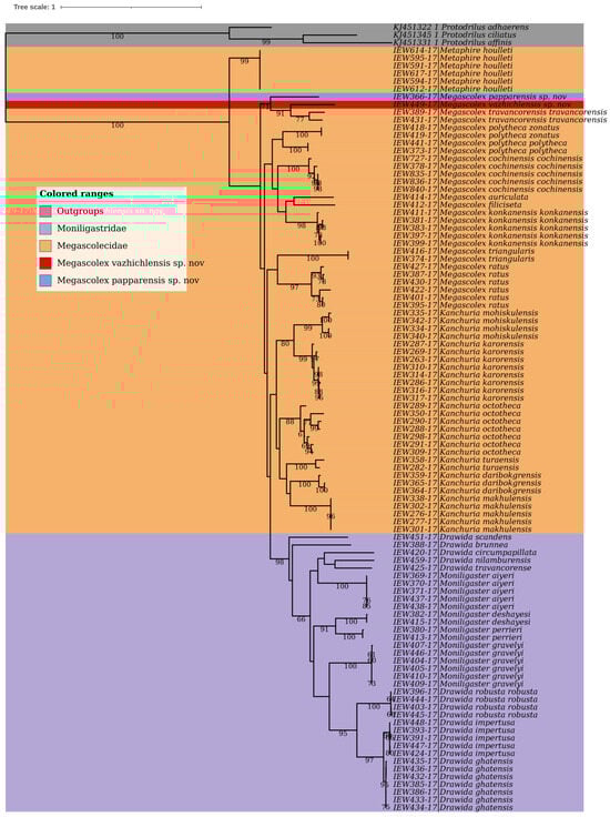 Earthworms are the group of Oligochaeta worms that are known for their soil-dwelling properties and ecosystem functions that include soil turnover, soil fertility, and biomass [1,2]. Megascolecidae is the most diverse family of earthworms [3] comprising over 1000 species [3,4], most of them being native to Asia and Australia [4]. Out of many genera of the family Megascolecidae, the genus Megascolex was first described by Templeton [5] under the name M. caeruleus from the alpine regions of Ceylon (Sri Lanka), characterised by the presence of a row of small numerous spines or setae on each segment. Since then, 37 species and sub-species of Megascolex have been reported from Sri Lanka [6]. In India, the genus is comprised of 33 species [7], out of which 24 species were presented in a checklist by Narayanan et al. [8]. However, with the addition of Megascolex lawsoni (Bourne, 1894) from the state [9], the list was updated to 25 species with the presence of M. insignis as the only near-endemic species which occurs both in India and Sri Lanka [6]. The distribution of Megascolex species in India has been reported from peninsular parts, particularly in the southern part of India [9,10,11,12]. Kerala is an important constituent part of the Western Ghats and houses 99 species of earthworms [9]; however, just a few molecular studies have been conducted on Drawida and Moniligaster species [13] and there are no molecular records for Megascolex species.