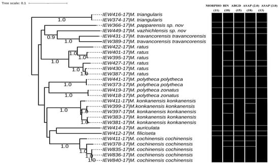 Maximum likelihood dendrogram showing species delimitation analyses of the COI dataset of Megascolex species of Kerala (black rectangles). MORPHO = Morphology, BIN = Barcode Gap Index Number, ABGD = Automatic Barcode Gap Discovery, and ASAP = Assemble Species by Automatic Partitioning at 2.0 and 3.0 ASAP scores.