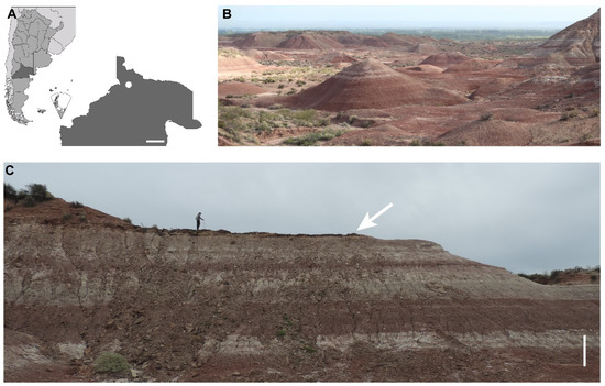 The Anacleto Formation [56] is a succession of predominantly pelitic to fine-grained psamitic rocks [7], formed in a fluvial environment of low energy, with flowing streams in wide alluvial plains [57,58]. It lies in sharp, planar, erosional or transitional contact above the Bajo de la Carpa Formation [58,59] and is unconformably covered by the Allen Formation of the Malargüe Group [57,60,61]. The lower to middle Campanian age of the Anacleto Formation is based on magnetostratigraphic analyses in the Auca Mahuevo area, Neuquén Province [7,62]. Recently, U–Pb detrital zircon ages from a sample of the Anacleto Formation in Paso Córdoba, Río Negro Province, gave a maximum depositional age of 78.6 ± 1.7 Ma (middle Campanian) [63].