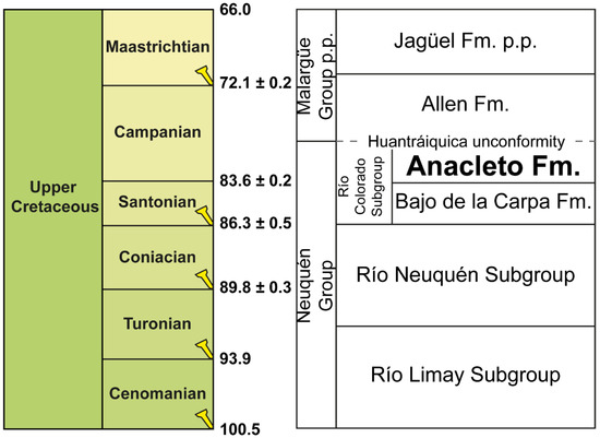 Chronostratigraphic scheme of the Upper Cretaceous units of the Neuquén Basin, showing the Neuquén Group and the Cretaceous portion of the Malargüe Group (redrawn and slightly modified from [7]). Absolute ages according to the International Chronostratigraphic Chart (version 2022/02 accessed on 1 February 2022; retrieved from www.stratigraphy.org).