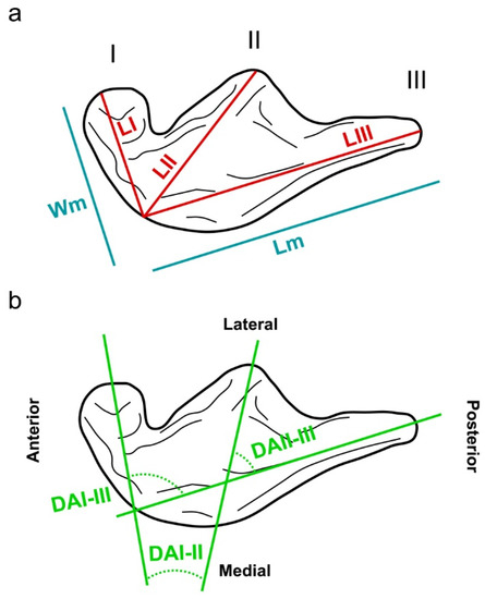 (a,b) Orientation of the tracks and measurements used in this work: Lm, length of manus imprint; Wm, width of manus imprint; LI, length of digit imprint I; LII, length of digit imprint II; LIII, length of digit imprint III; DAI–II, divarication angles between digit imprints I–II; DAII–III, divarication angles between digit imprints II–III; DAI–III, divarication angles between digit imprints I–III.