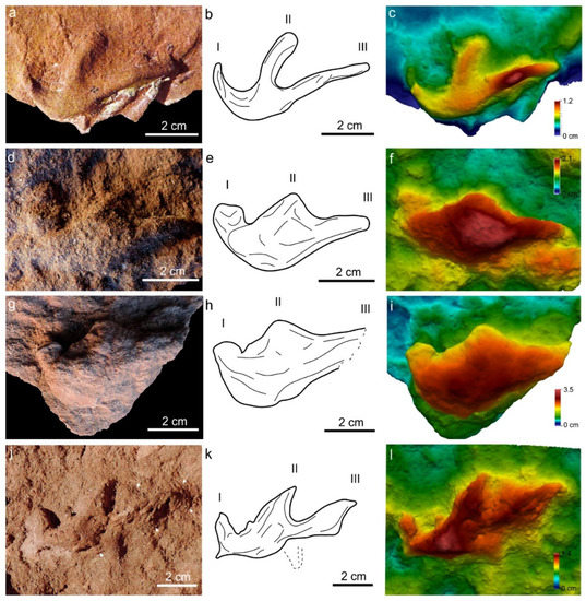 Track M4 (Figure 4j–l) is 7.5 cm long and 3.0 cm wide (Lm/Wm = 1.88). The digit I impression is the shortest of the three (2.4 cm long), elongated, straight, laterally oriented, with a roughly rounded end. The imprint of digit II is 4.5 cm long, sub-triangular in outline, posteriorly curved, with an acuminate end. The digit III impression is the longest of the three (6.7 cm), being elongated, straight, and posteriorly oriented, with an acuminate end. The border at both hypexes (between I–II and II–III) forms similar tight outlines. The divarication angles formed between digits I and II impressions and between II and III are very similar (46° and 40°, respectively), and the total divarication between I and III is almost a right angle (86°). The thickest region of this track occurs in the posterior area of digit II (up to 0.5 cm high), and digits II and III impressions are thicker than I and almost similar to each other.