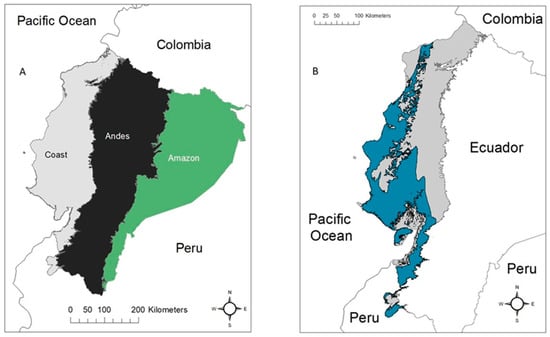 (A) Map of mainland Ecuador and its three geographical regions. (B) Map showing the seasonal dry forest (blue) on the equatorial coast (grey).