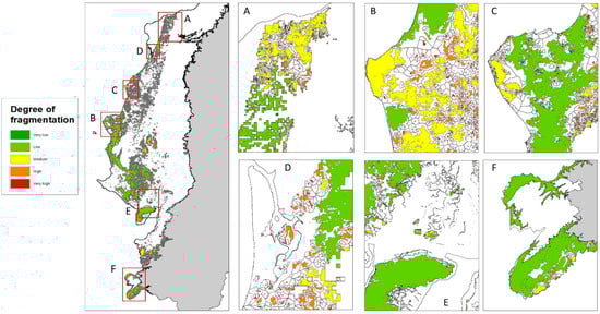 Degree of fragmentation of the seasonal dry forest in Ecuador in 1990 (left) using the PFI. The figures in details (A–F) show the state of fragmentation of the patches and their area of influence (black lines): (PFI ≥ 0.8), high (0.6 ≤ PFI ≤ 0.79), medium (0.4 ≤ PFI ≤ 0.59), low (0.39 ≤ PFI ≤ 0.2), and very low (PFI ≤ 0.2).