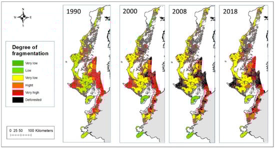 The PFI was also used to measure temporal change. The areas of influence (Ai) created for the seasonal dry forest in 1990 were then used to calculate the PFI for the years 1990, 2000, 2008, and 2018, converting the seasonal dry forest into a raster of 100 m of spatial resolution in order to delimit native forest patches. A value of PFI = 1 was given to the areas of influence in which the patches disappeared in the years 2000, 2008, and 2018 (the maximum fragmentation rate is considered if a patch has disappeared). In the areas of influence in which the number of patches increased (in the years 2000, 2008, and 2018), the new patches were considered as part of the original in 1990. This increase in the number of patches may result from reforestation or from large patches being divided.