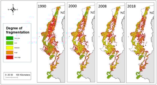 Fragmentation is a process that must be monitored for effective forest management. Monitoring helps to highlight those areas of rapid change that require the attention of conservation professionals and forest managers on the ground, and it also helps researchers to understand direct and indirect socio-economic drivers of loss []. Changes in fragmentation at the patch scale (increasing, decreasing, or maintaining) cannot be assessed if certain measures for different times are not available, which is why the temporal evolution of fragmentation is very useful with regard to making decisions and identifying the causes and consequences of fragmentation.