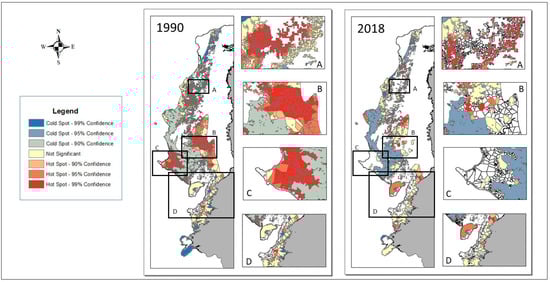 The analysis carried out by Getis-ord Gi * (hotspots) has been proven to be efficient at supporting decision-making [,], showing its importance with regard to helping to identify priority areas for policy. It allows policymakers to maximize the benefits of a preferred policy option, and facilitates decisions related to the optimized use of the land [].